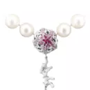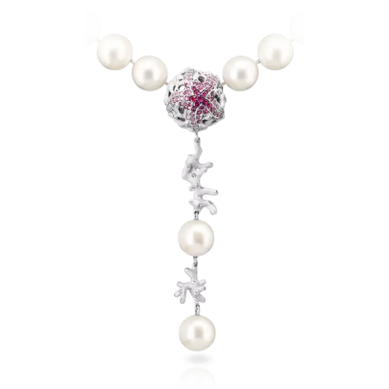 Вечернее колье в форме морской звезды с жемчугом и кораллами из матового белого золота. Декорировано рубинами и бриллиантами.