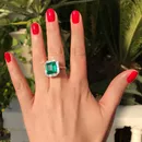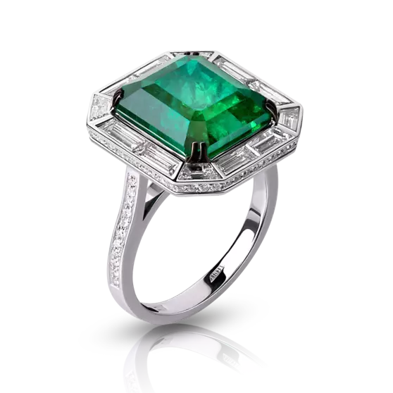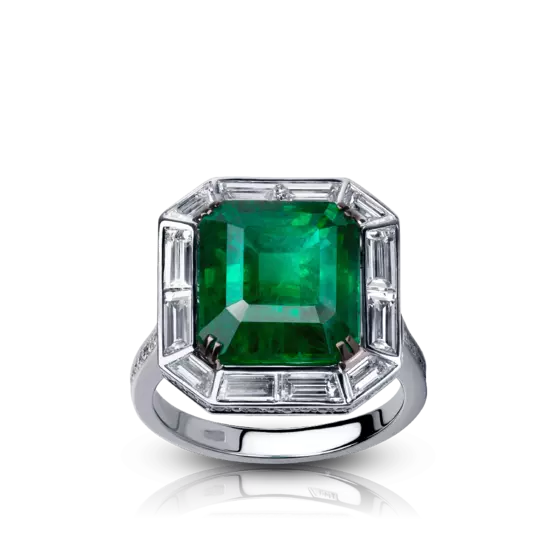 Мы выложили 12 сверкающих бриллиантов вокруг красивейшего изумруда топового цвета Vivid Green из Замбии. И получили супер эффект, ровные прямые блики бриллиантовых багетов контрастируют с насыщенным зеленым, кажется, как будто изумруд лежит сверху на большом бриллианте.