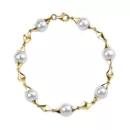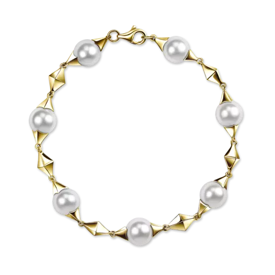 Элегантный браслет с белым морским жемчугом Акойя. Неповторимый эффект создают подвижные элементы – сверкающие грани желтого золота и мерцание белых жемчужин.
