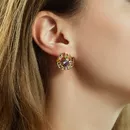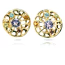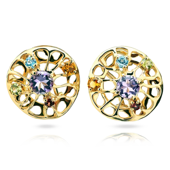 Объемные и яркие серьги из желтого золота с аметистами, топазами, гранатами, хризолитами и цитринами.